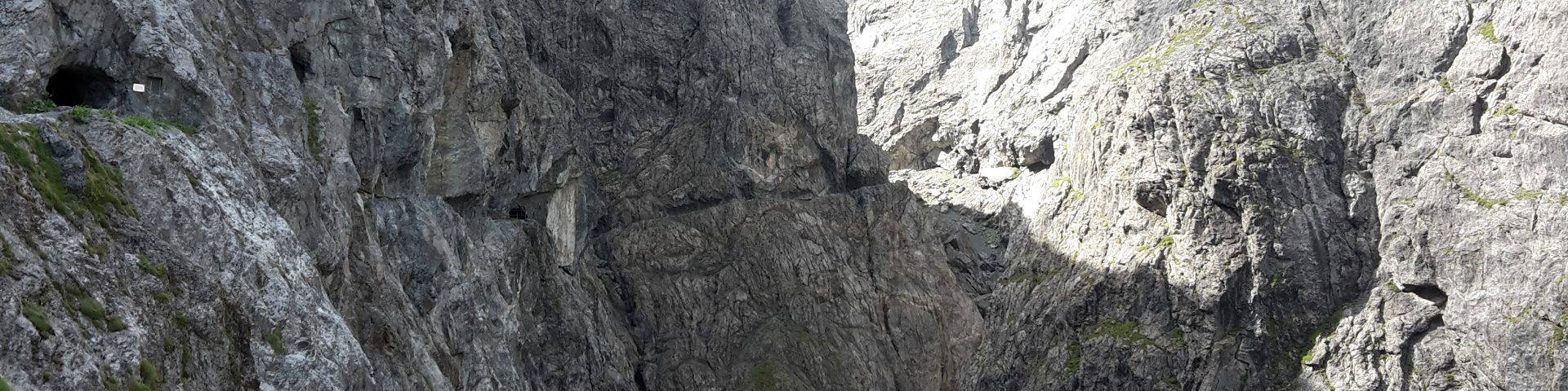 Halb fahren, halb schieben bis kurz vor dem Eingang zur Felswand. Hinten im Foto ist die in den Fels gehauene Rinne zu sehen.