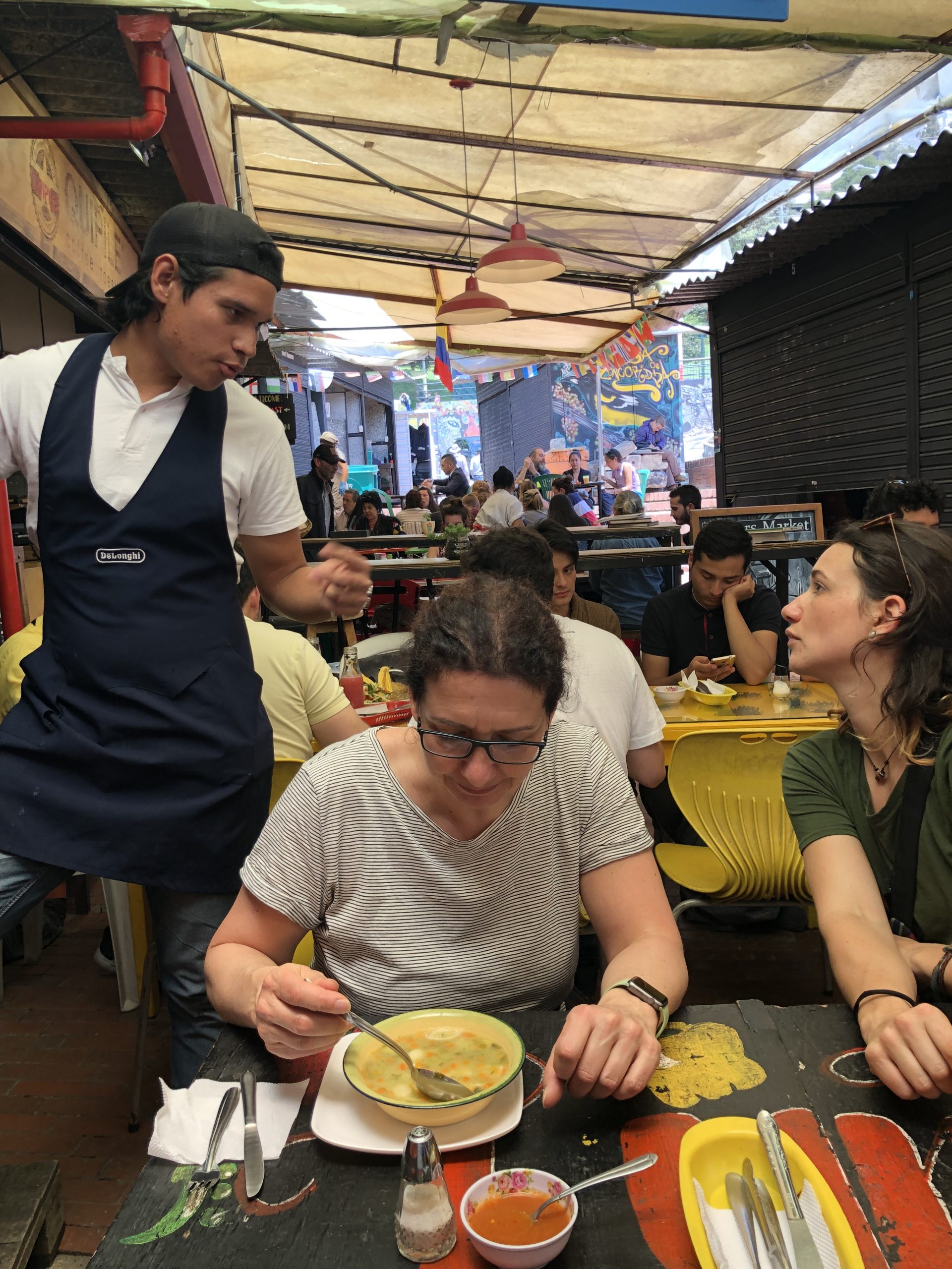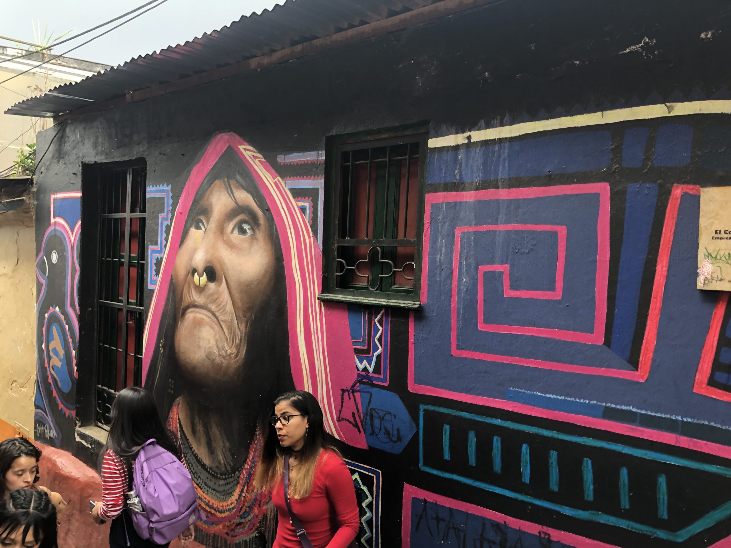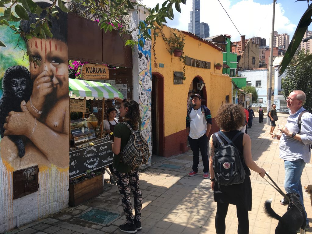 Da sitzt man ganz gemischt an den Tischen wo halt Platz ist. In Sarahs Gespräch mit unserem Tischnachbarn hat sich dann herausgestellt dass er der Graffitikünstler ist der die Ureinwohner malt. Dessen Graffitis sind wirklich eine große Nummer in Bogotá.