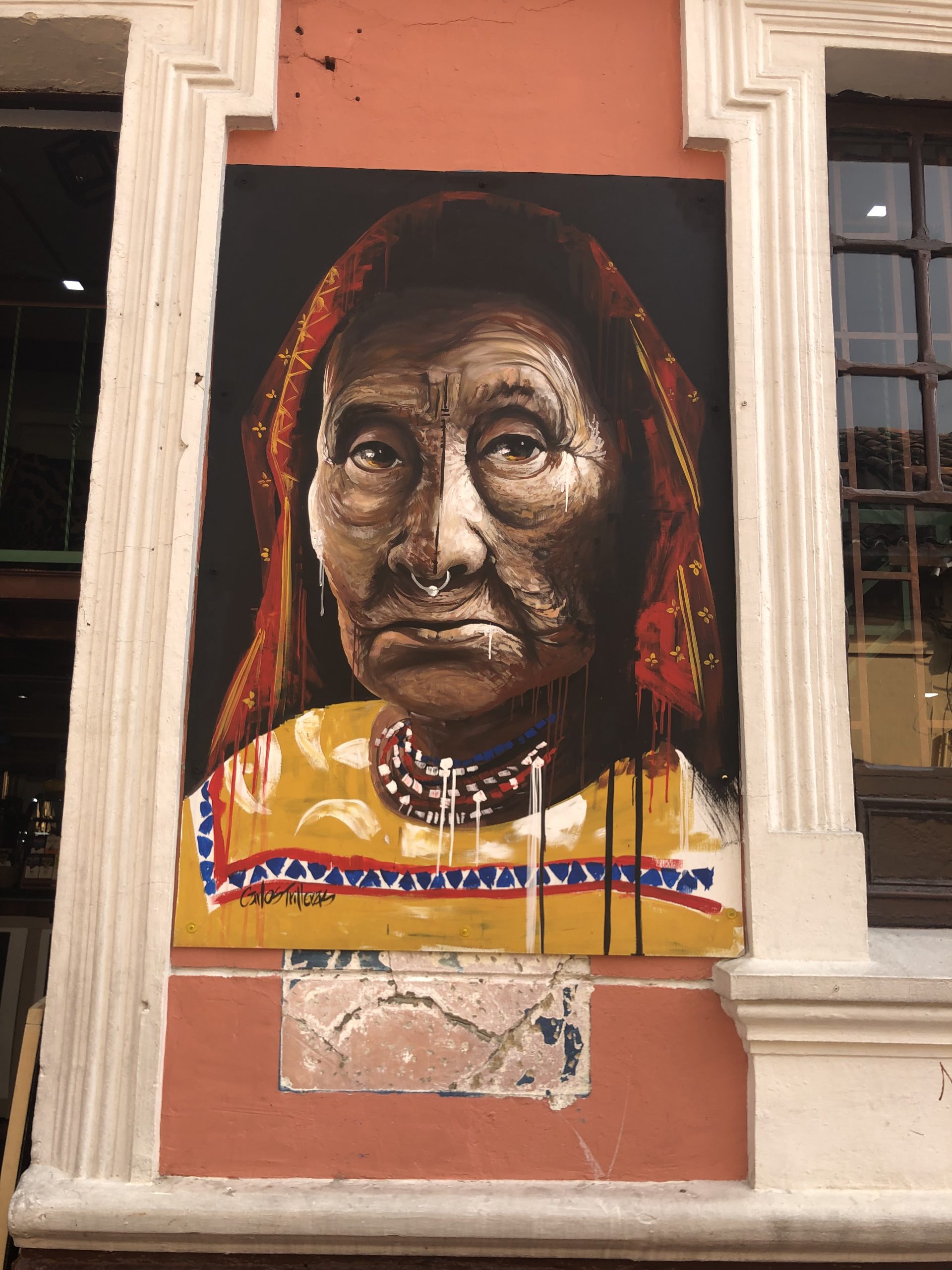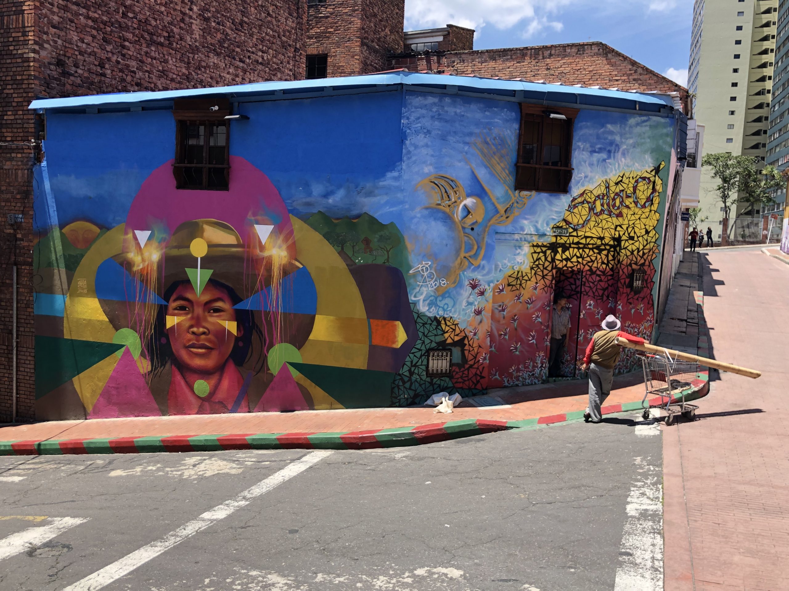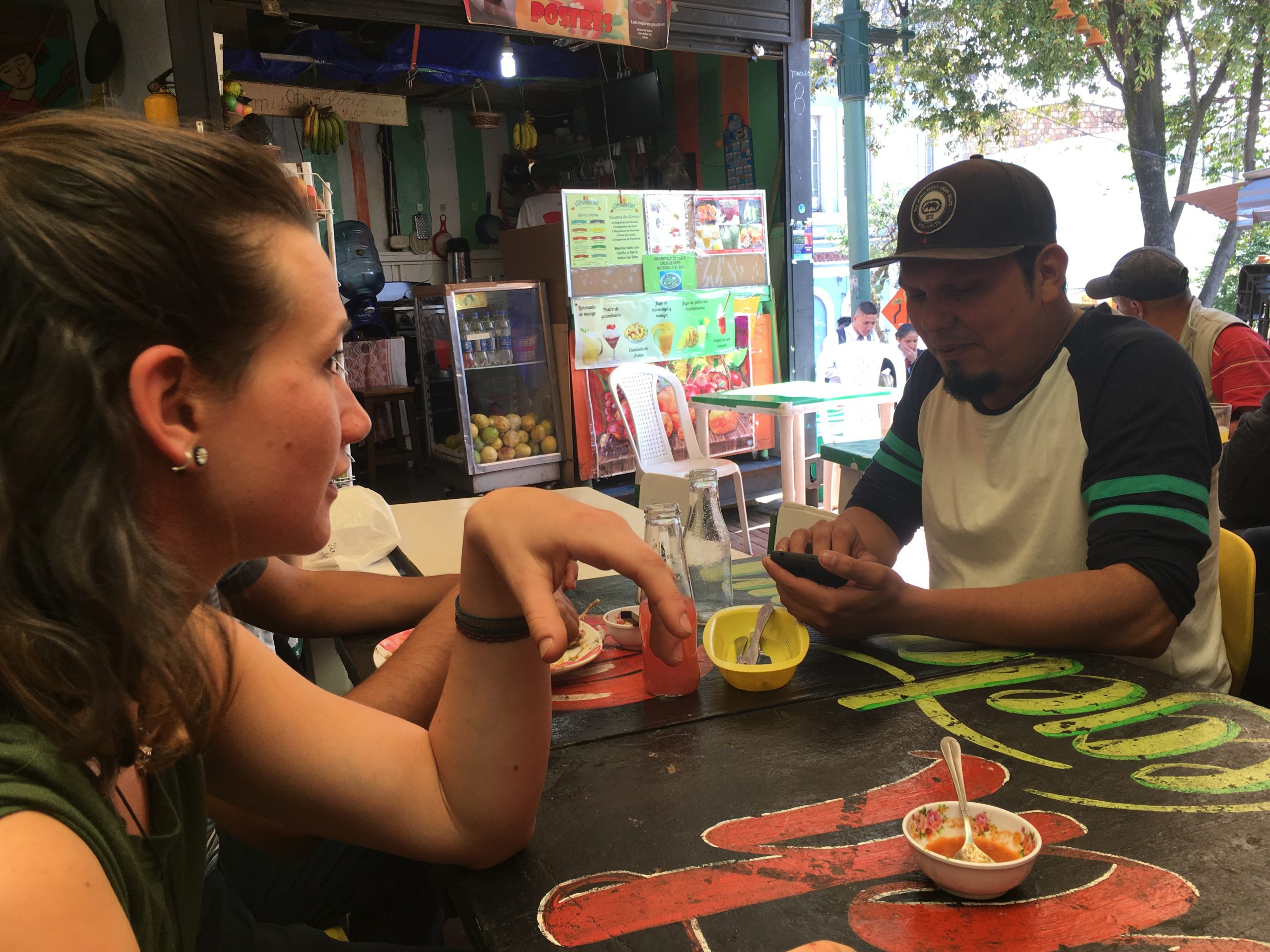 Da sitzt man ganz gemischt an den Tischen wo halt Platz ist. In Sarahs Gespräch mit unserem Tischnachbarn hat sich dann herausgestellt dass er der Graffitikünstler ist der die Ureinwohner malt. Dessen Graffitis sind wirklich eine große Nummer in Bogotá.