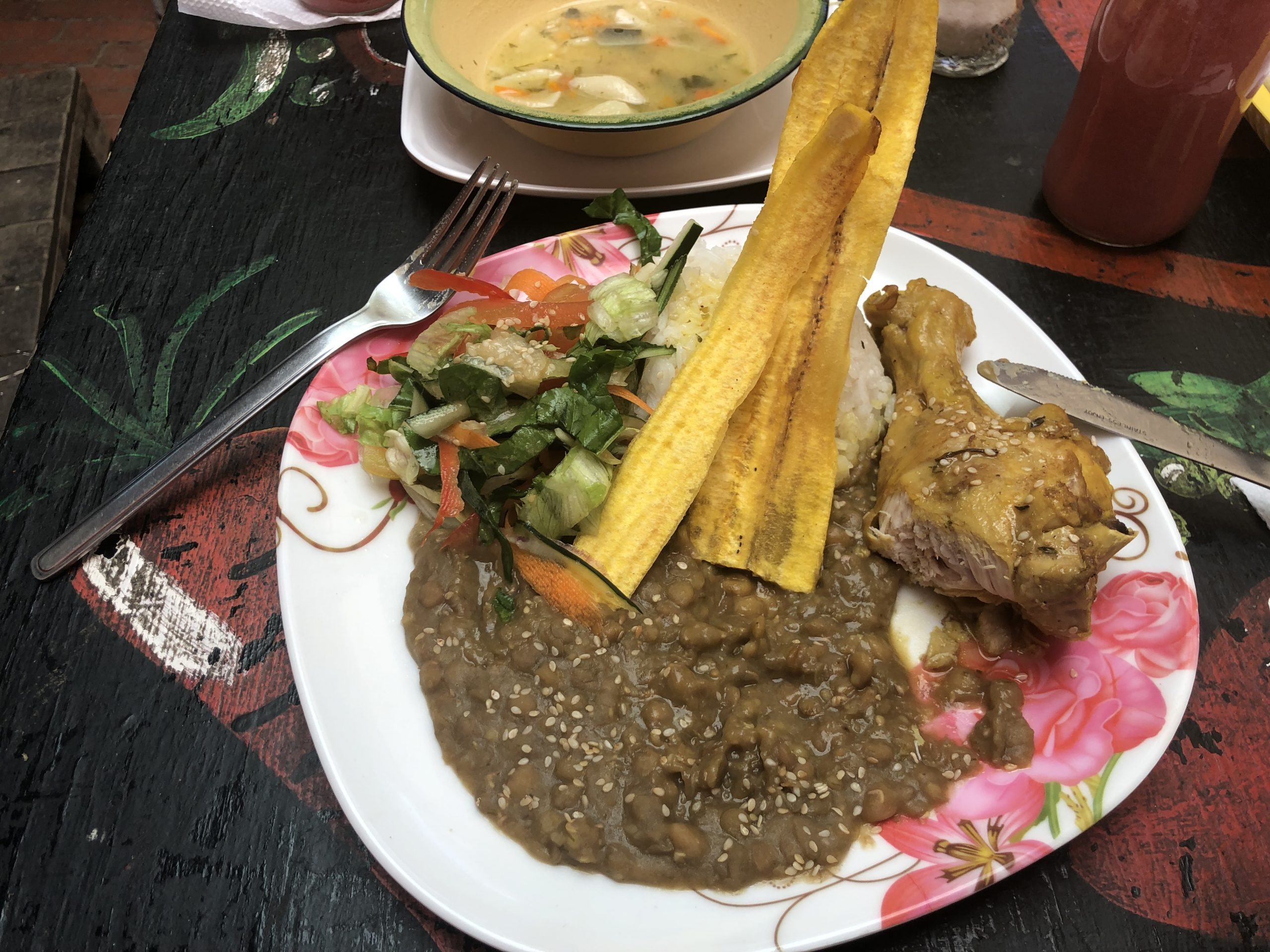 Wir sind dann zum Mittagessen spontan in einen FoodPark (man erinnere sich an gestern, die kleine outdoor Variante der Freiburger Markthalle) gegangen um das traditionelle Mittagessen der „normalen“ Kolumbianer zu geniessen: zuerst Suppe, dann Hähnchen mit Linsen, Reis, Kochbanane und Salat. Kostet 10€ inklusive Getränk. Wohgemerkt für alle, also 2,50 pro Person.