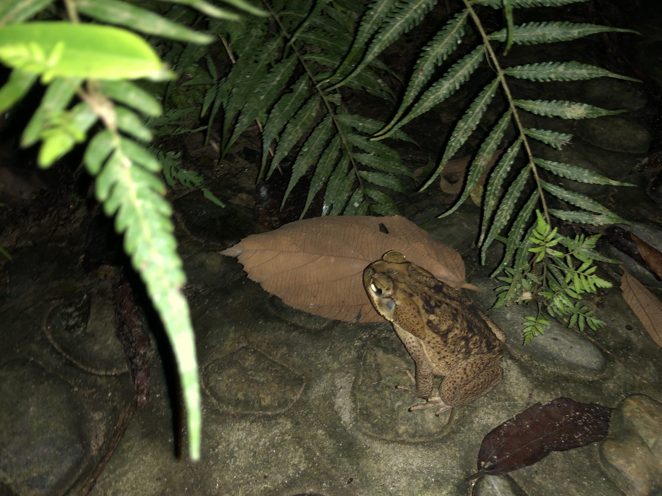 Wir haben Nachts auf dem Weg ins Häusle nur solche Kröten gesehen. Aber Robinson, unser Guide, hat mir Filmchen gezeigt von einer 4 m langen Boa Constrictor die auf dem Weg lag oder von Faultieren. Hatten wir leider nicht gesehen.